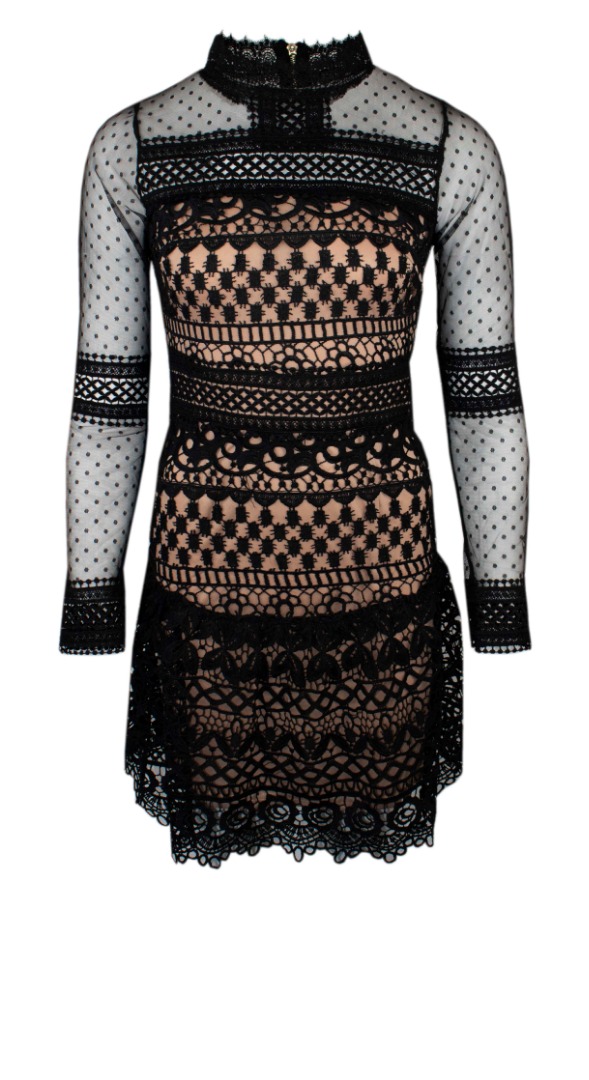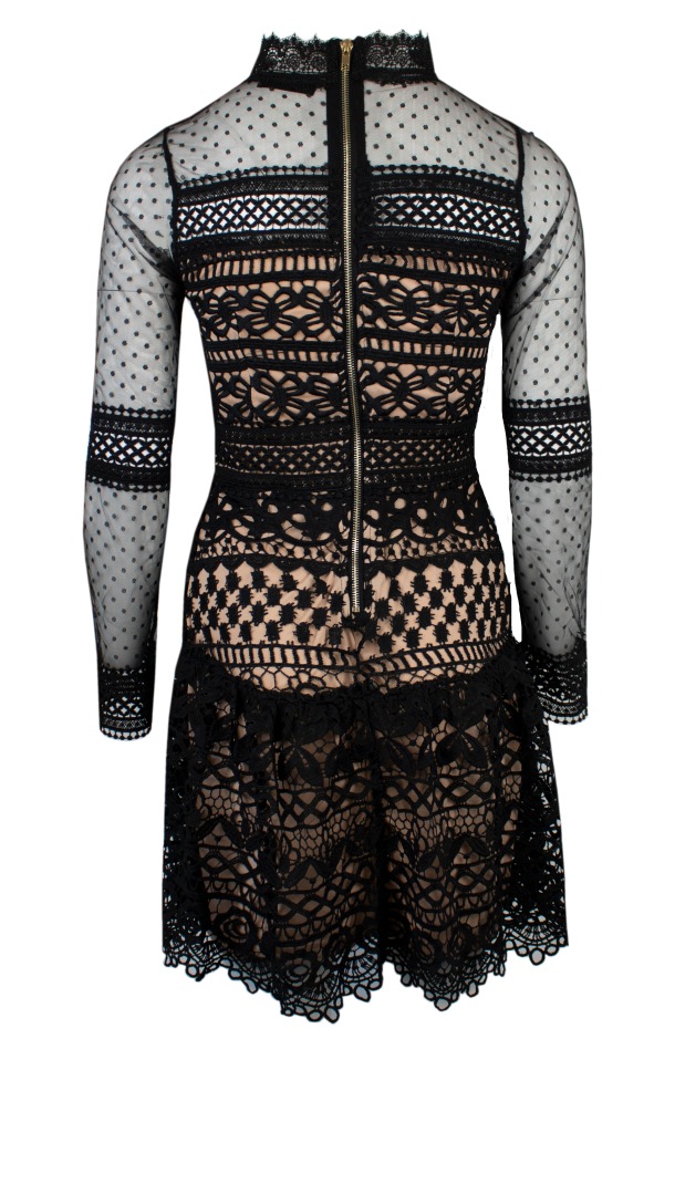 The lace party dress! Heb jij binnenkort een feest, bruiloft of diner en wil je graag een mooie feestjurk dragen? Met dit opvallende item, weet je zeker dat je in de spotlights staat. De Lace Dress Lilly Mcbee heeft zwart lace met beige onderjurk. En goude rits aan de achterkant.