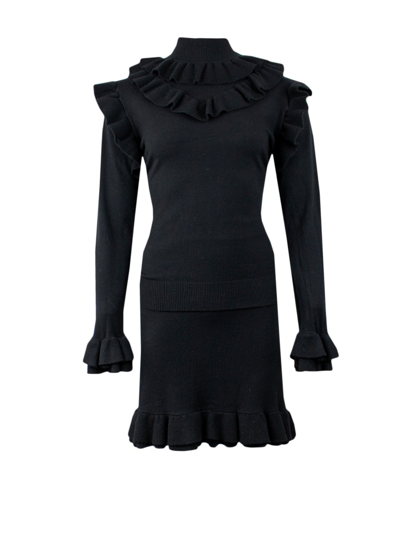 De RUFFLE TWO PIECE BLACK is gemaakt van een fijn materiaal om de hele dag heerlijk in te kunnen dragen. De ruffles geven dit setje net even wat extra's. Dit setje is ook los van elkaar te dragen. Het rokje heeft aan de bovenkant een elastiek. Aan de achterkant van de trui zitten geen ruffles.