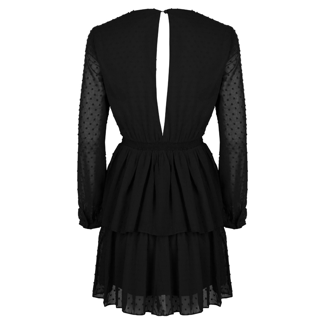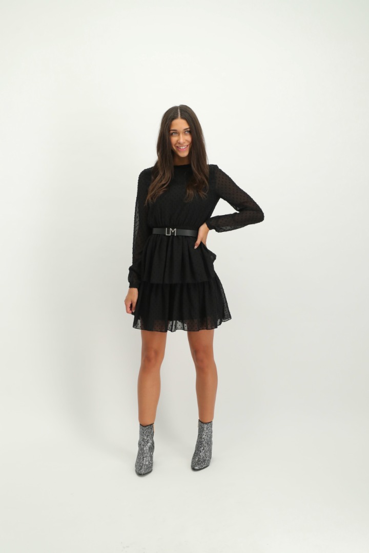 De zwarte see-through jurk Vincenza is bedekt met een stippen effect, wat deze jurk een net wat verfrissender maakt dan je normale little black dress. Onder de jurk zit een zachte zwarte onderjurk, zodat deze jurk ook geschikt is voor de wintermaanden. Om de taille zit een elastische band, die ervoor zorgt dat deze jurk getailleerd valt en de jurk een extra vrouwelijke touch geeft. De jurk heeft een midi lengte, verdeeld over twee lagen. Dit geeft een unieke look & feel aan deze dress!