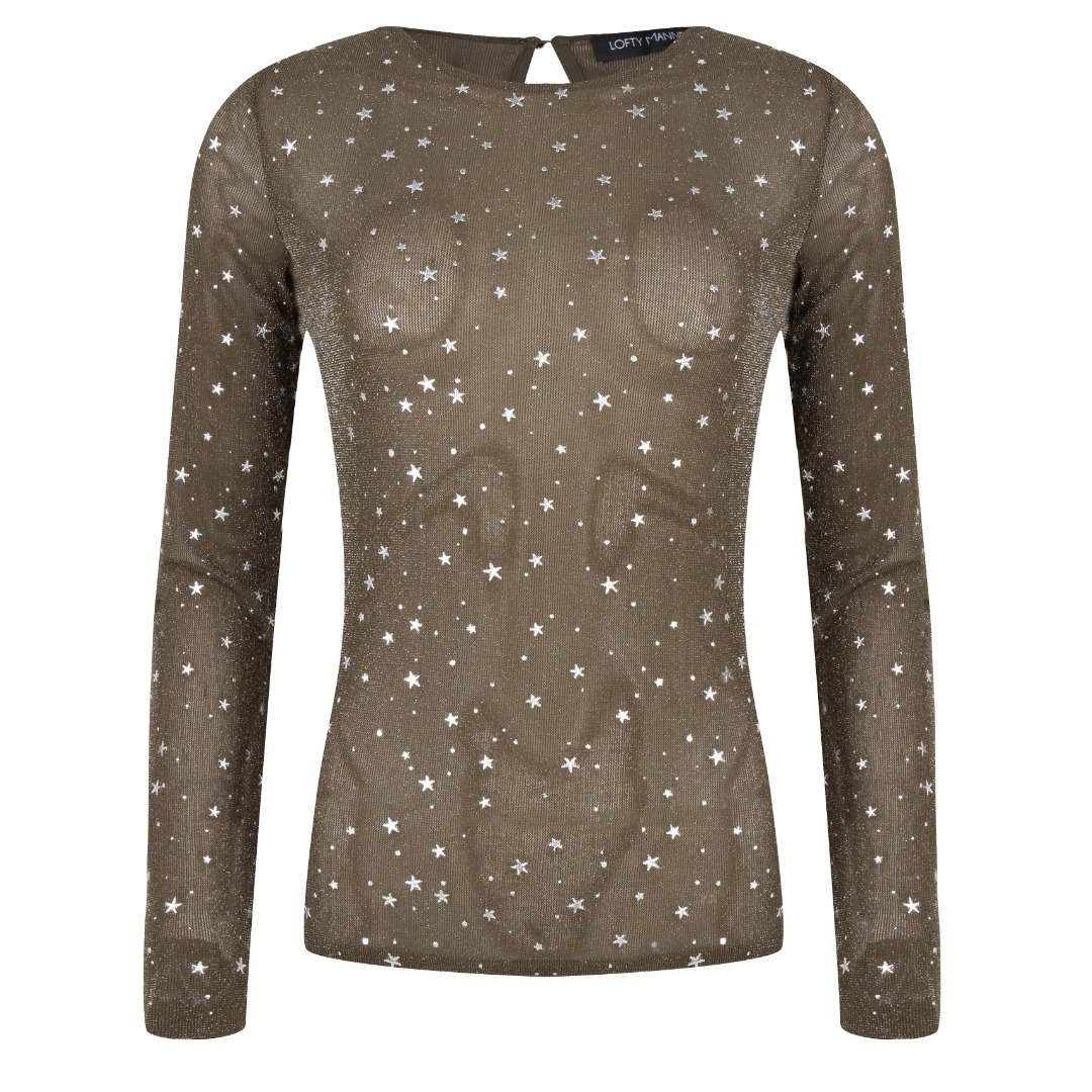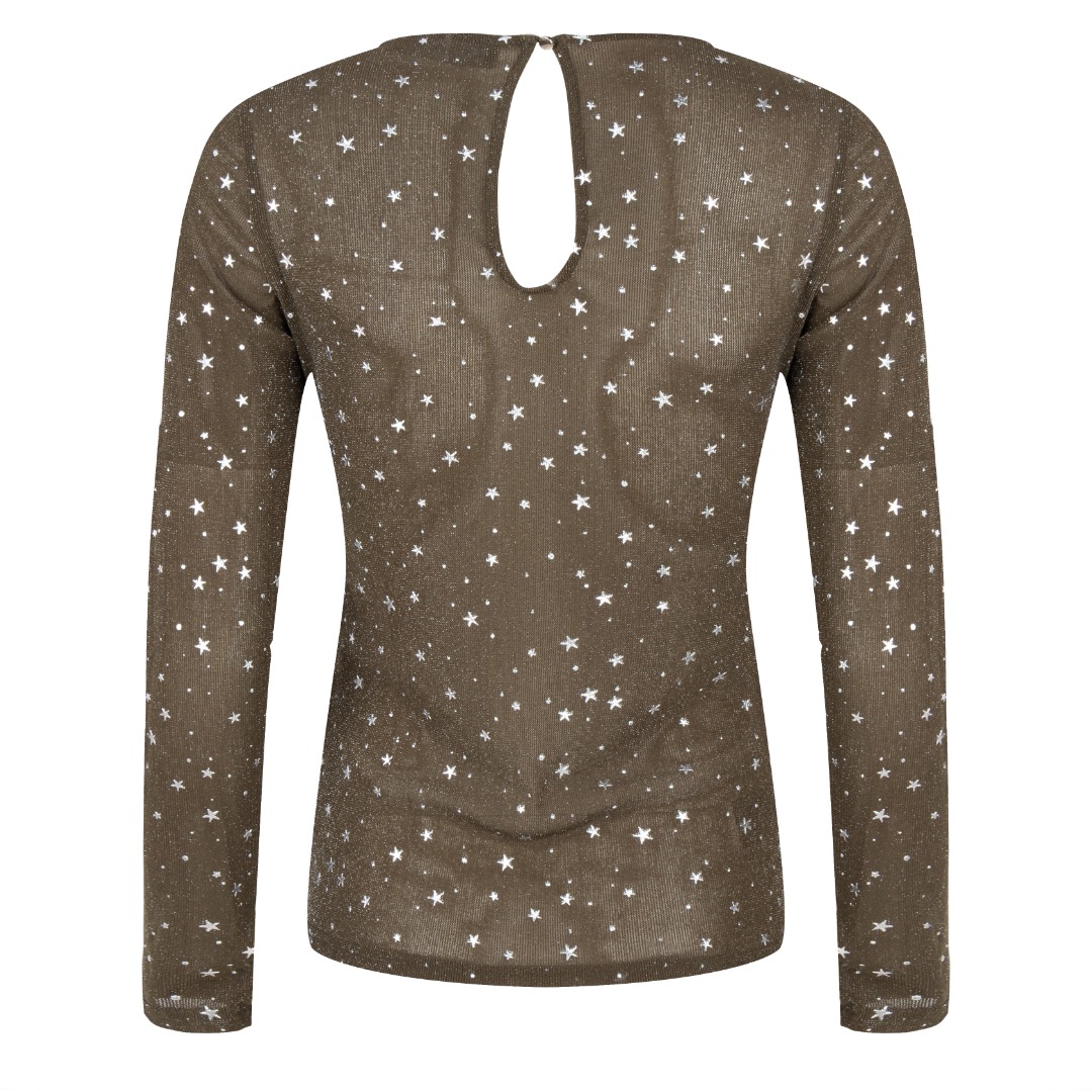 De groenen top Annabel is een see-through shirt met een speels glitterdetail en een prachtige zilveren sterretjes. Door de enkele knoopsluiting in de nek is de top mooi afgesloten om de hals en is er een subtiele opening te zien. De stof is luchtig en fris door het nylon-mesh. Hierdoor is dit shirt ook heerlijk stretchy, wat er voor zorgt dat deze altijd goed zit. De mouwtjes sluiten strak af om de pols met een kleine elastische band.