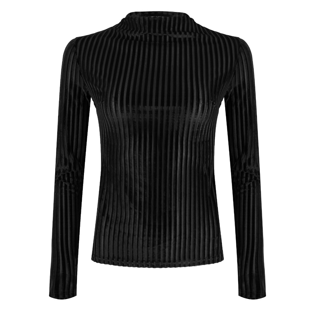 Dit zwarte Santina shirtje is elegant met een scherp randje. Het is een doorschijnende top die bedekt is met verticale ribbels, gemaakt van zwart velvet. Dankzij de stof en de rechte pasvorm van de top, voelt deze longsleeve fluweelzacht aan. Dit topje dankt zijn elegante look aan de hoge kraag en lange mouwen.