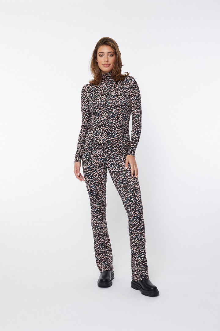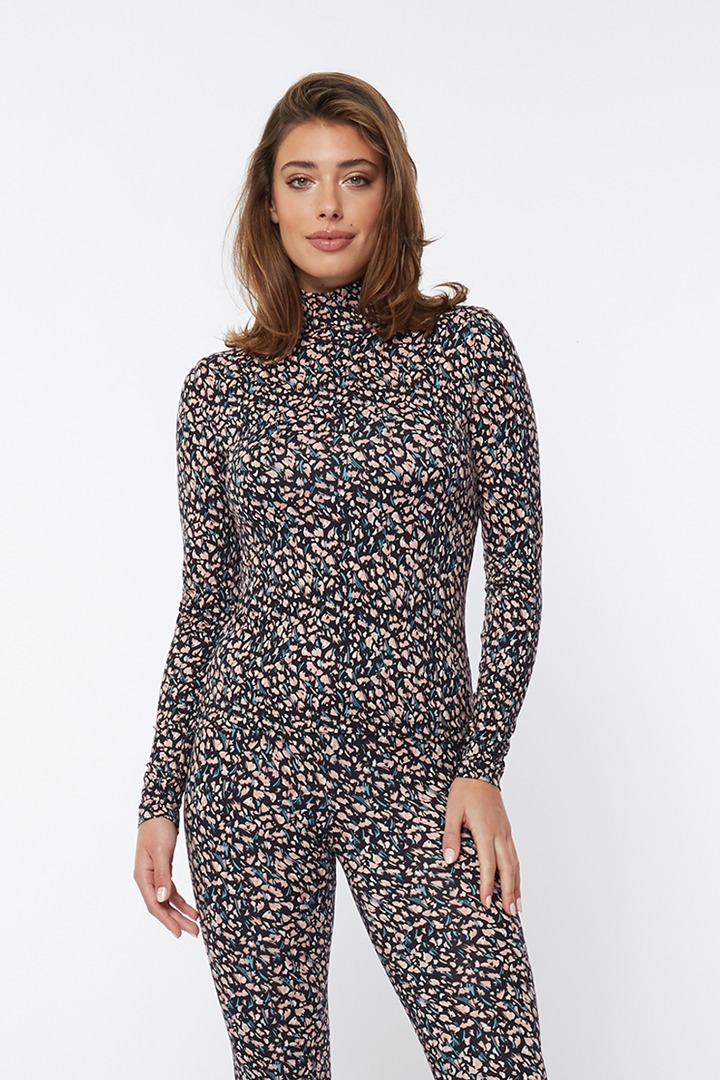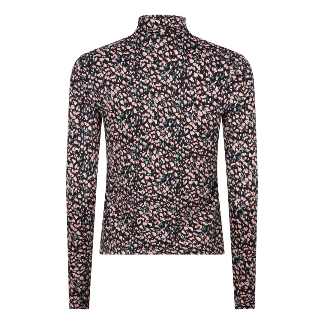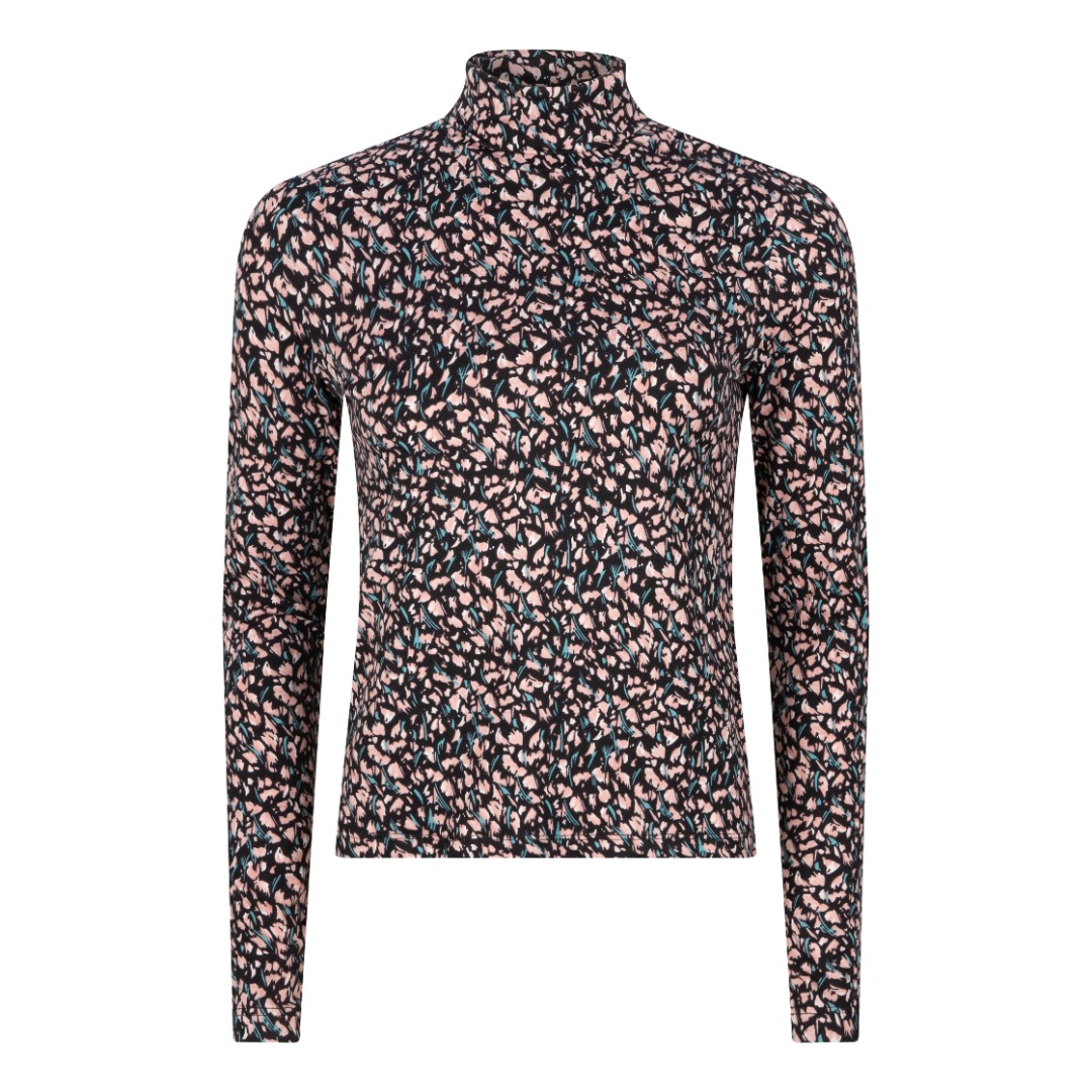 Deze zwarte top heeft een mooie print van roze, aqua en wit. En als je van een heerlijk zacht stofje houdt is deze col met lange mouwen perfect voor jou. De top is zo zacht dat je hem het liefste iedere dag aan zou willen. De print top sluit aan op het lichaam en heeft een turtleneck. We love this top!
