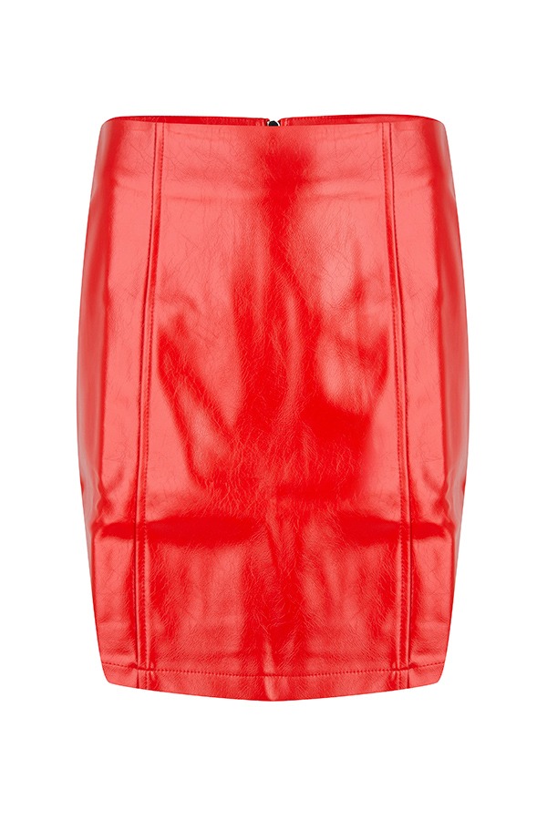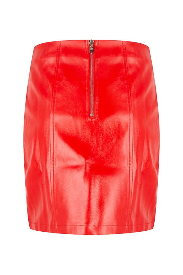 De rode Malini rok heeft een glanzende leer look. De rok voelt zacht aan en heeft een zilveren rits aan de achterzijde, die niet weggewerkt is en best mag opvallen. Aan de voor- en achterzijde van de rok zitten twee duidelijk naden, die jouw real curves benadrukken en deze rok super vrouwelijk maken.
