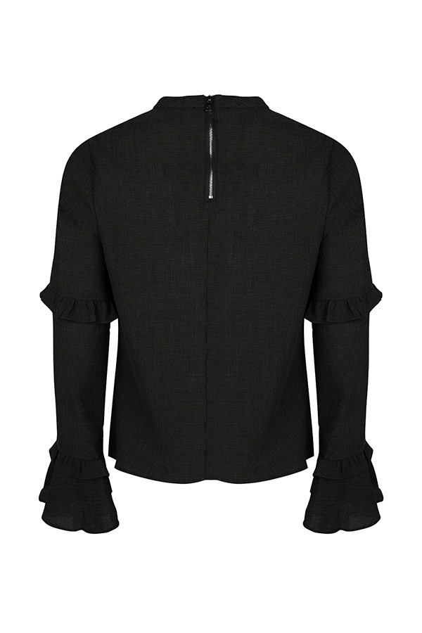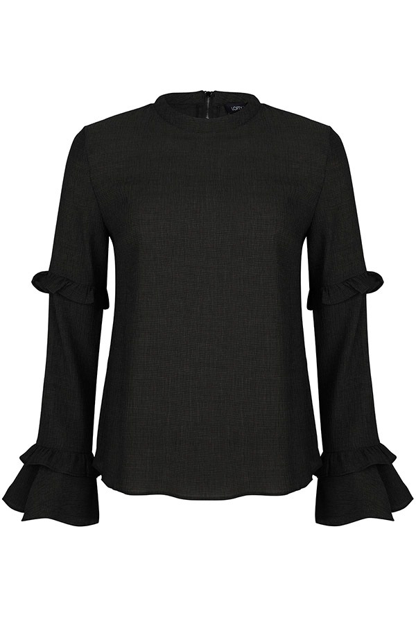 Deze zwarte top heeft prachtige mouwen met ruffels en een klokvormig uiteinde. Hierdoor krijgt het een echte high-fashion look! De texturized top heeft een boothals. De loose fit top loopt iets wijder uit aan de onderzijde. Je sluit het shirtje aan de achterkant door middel van de zilverkleurige rits.