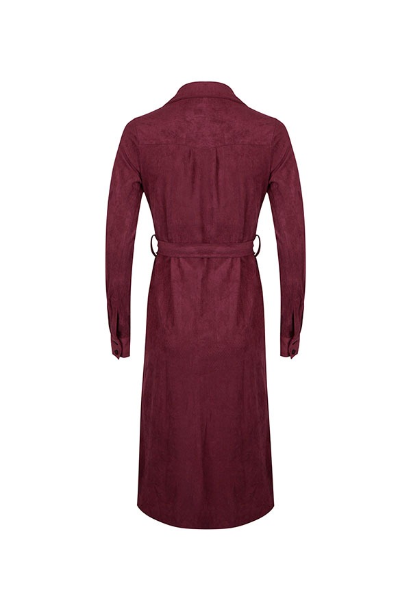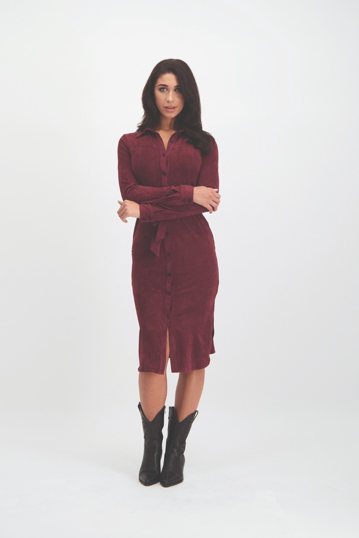 De suede jurk voelt erg warm aan door de dikke stof. De midi dress valt tot over de knie. De jurk sluit aan de voorkant met mat zwarte knopen. Het jurkje heeft bijzondere lijnen rondom de schouders en de taille. De jurk valt recht naar beneden en eindigt in twee kleine zij splits. De burgundy jurk heeft een brede kraag.
