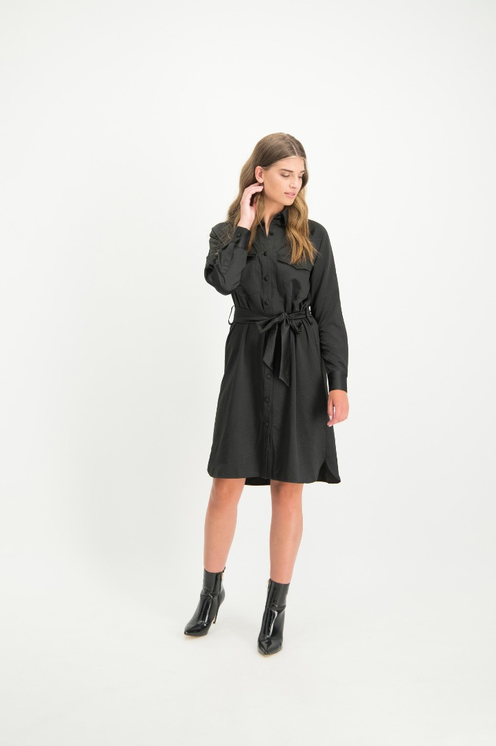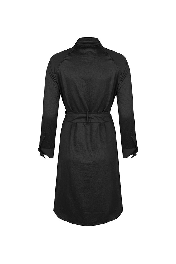 De jurk heeft een nette look door de overhemdkraag en de ronde knopen, die dezelfde glanzende stof hebben. Het ceintuur rondom de taille zorgt ervoor dat deze jurk mooi slank valt en super vrouwelijk is. De mouwen lopen uit in een knoopsluiting met dezelfde knopen als de rest van de jurk, om er een compleet geheel van te maken.