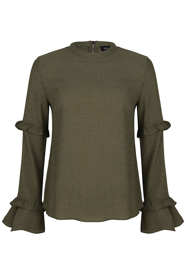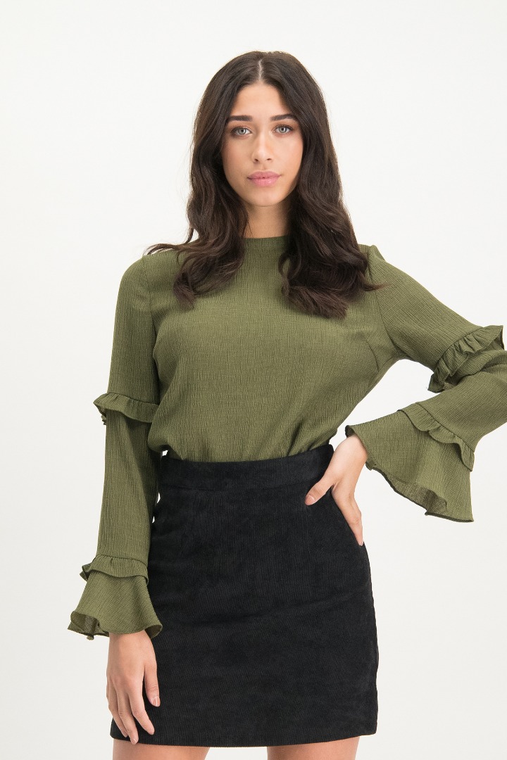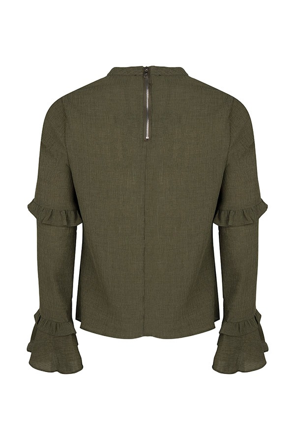 De top elina is gemaakt van een schitterende textuur stof. De mosgroene top heeft lange mouwen met klokvormige ruffles onder aan de mouw. De sluiting van de top zit aan de achterzijde, waar het sluit door de zilveren rits.